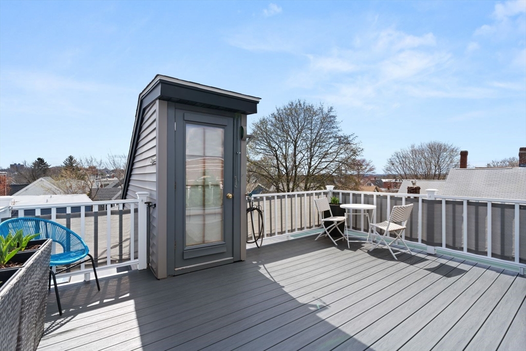 Beautifully appointed two bedroom two bathroom residence highlighted by an over-sized private roof deck and one full easily accessible parking space. The kitchen features white shaker cabinetry, gray / white quartz counters and stainless appliances. The master bedroom has a large walk-in closet and a private bath. The guest bedroom has a walk-in closet, custom built ins and direct access to a Jack and Jill style full bath with a glass enclosed shower. Enjoy summer gatherings on the large private roof deck which is accessed internally from a full staircase. Additional features include a private entrance with coat / shoe storage, central air, hardwood floors, four window exposures, in-unit laundry and private basement storage. The parking space is set up with EV charging capability. Situated within a free standing two unit building constructed in 2017. Steps to Magoun Square's shops and restaurants. Easy access to the Green line, bus routes and I-93.